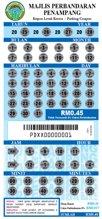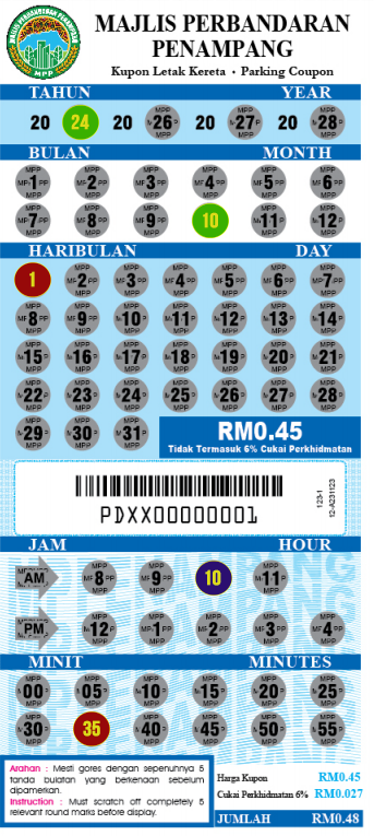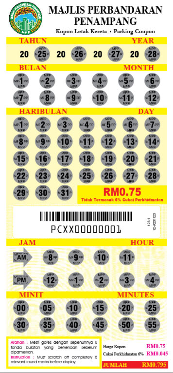 - Prepare the parking coupon(s) of sufficient value to pay for the parking fees and scratch off completely to mark the Year, Month, Day, Hour, Minute.